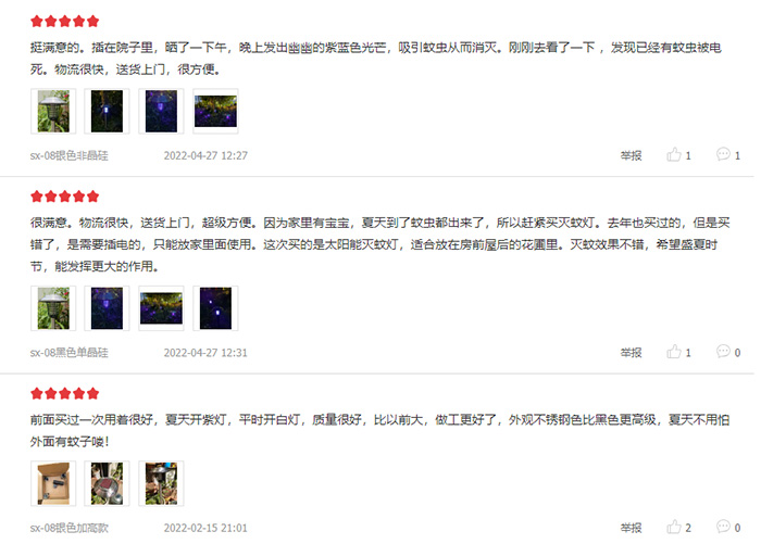 前面我們說(shuō)了,很多人認為戶(hù)外滅蚊燈是智商稅,疑慮就在于這里。事實(shí)上,根據我們多年的經(jīng)驗和用戶(hù)反饋,只要是在滅蚊燈“殺傷力”范圍內,蚊子困擾是可以明顯緩解的。至于這個(gè)“殺傷半徑”,你可以在產(chǎn)品的介紹上查看,也可以說(shuō)明自身情況,讓商家給推薦,這樣才會(huì )實(shí)現更好的滅蚊效果。你擔心蚊子“取之不盡用之不竭”,其實(shí)滅蚊燈也不那么差勁,它可以持續、自動(dòng)消滅蚊子,只要路過(guò)的,就有機會(huì )被永遠地留下來(lái)。